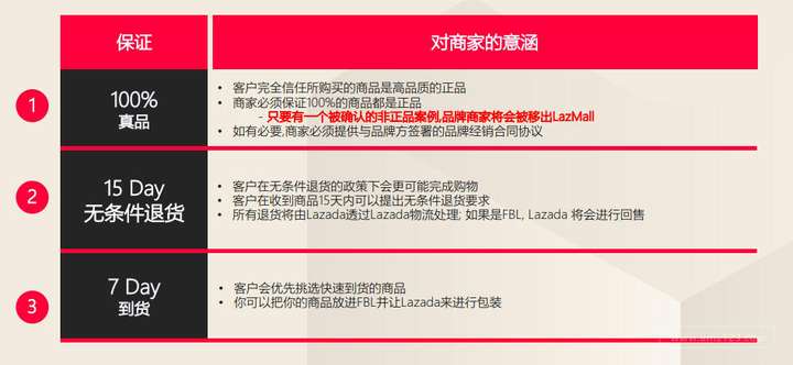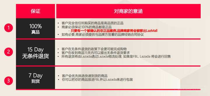 以下为 Lazmall商家必须要做到的保证与服务的条件: